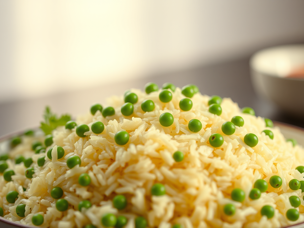 After 15 minutes, remove and check the rice is tender and the water has been absorbed, fluff up with a fork. Add hot cooked peas at this point and fork through evenly or scatter on top before serving.