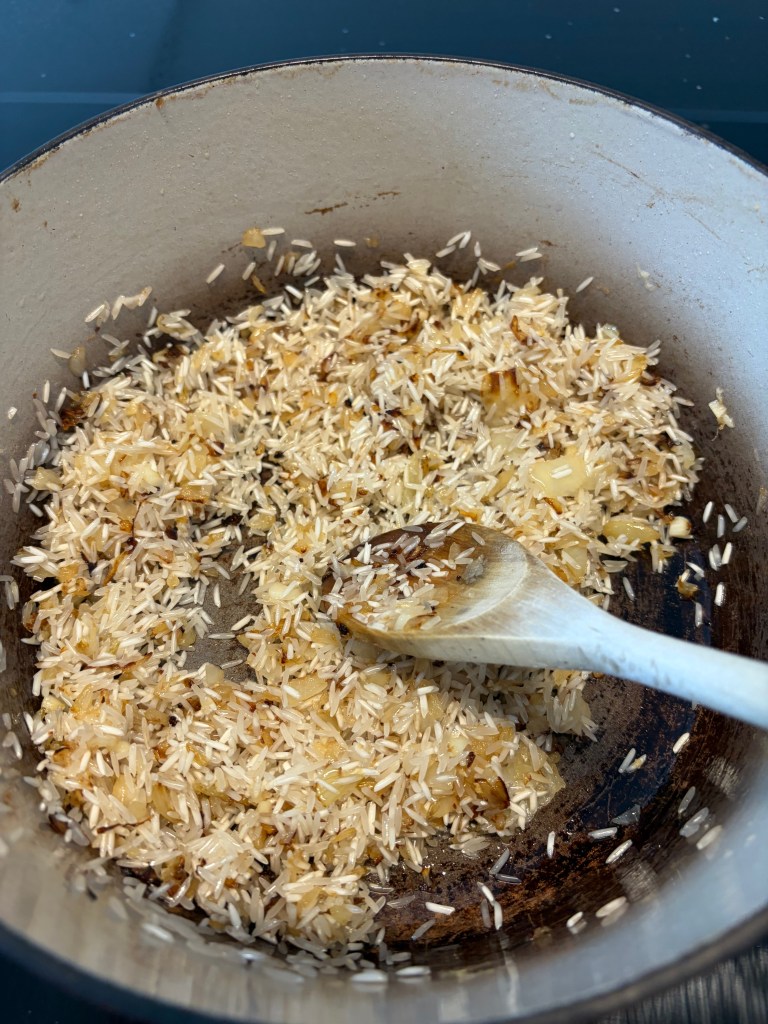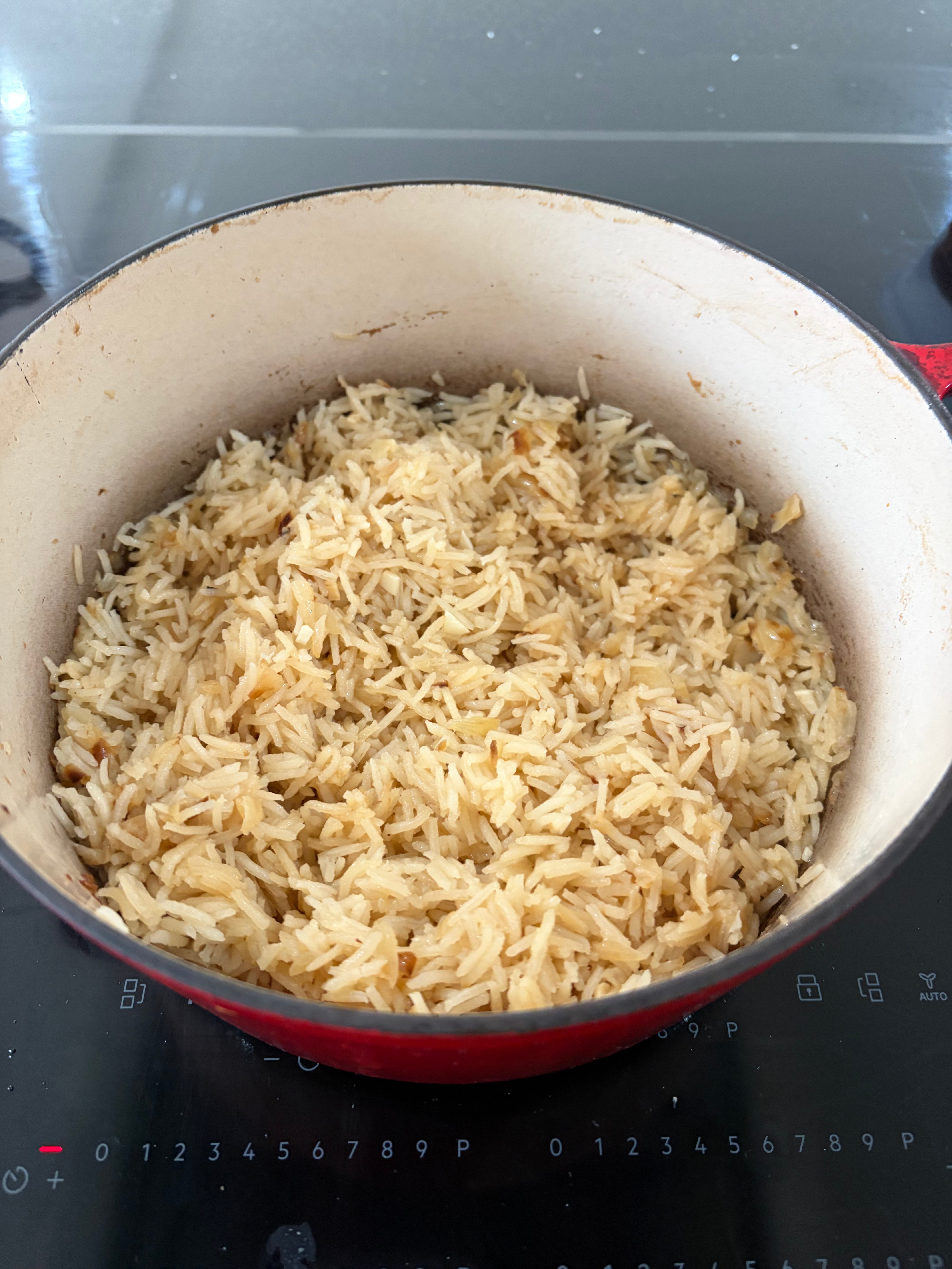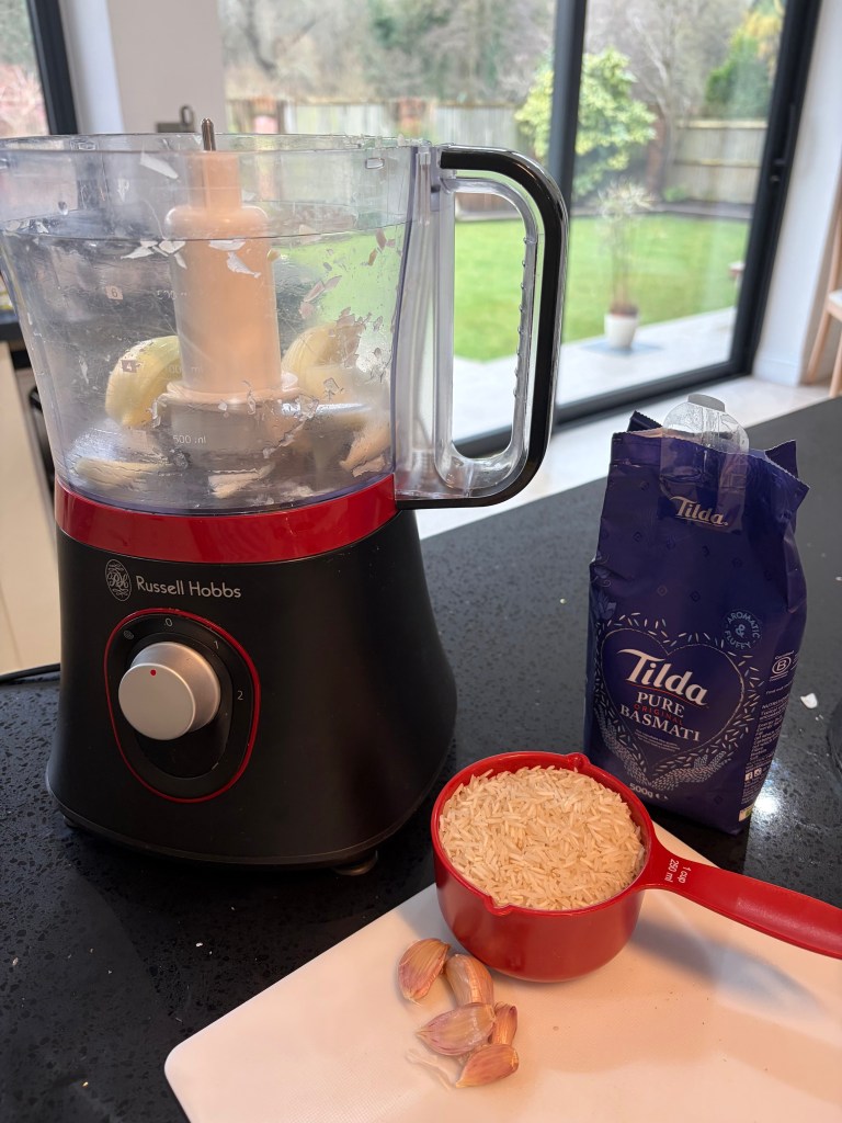 This recipe is not in the book but is unquestionably my favourite rice and other than the faff of frying the onions, is very simple to make. Don’t get me wrong, I do enjoy a plain basmati rice but the garlic and the peas in this makes it simply delicious. I’ve done the measuring in cups because it makes it so easy, if you haven’t got a set of US cups it doesn’t matter what size your cups are as long as you use the same one for everything.
