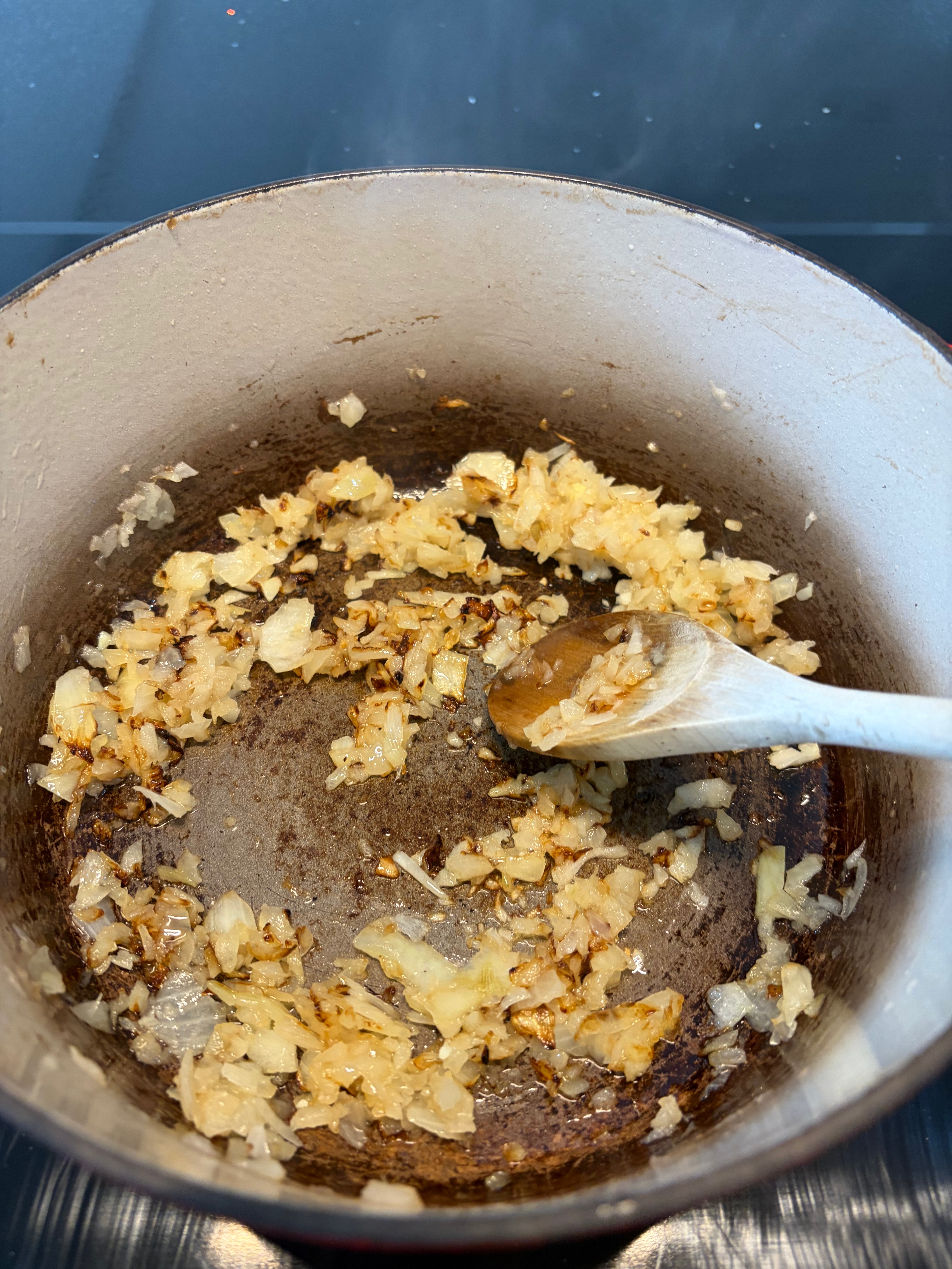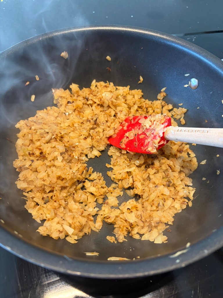 • Add the onions and fry for at least 10 minutes (more if you’ve got the patience) until lovely and caramelised.