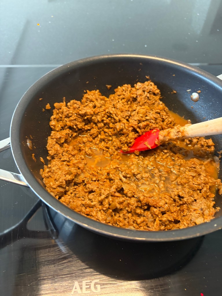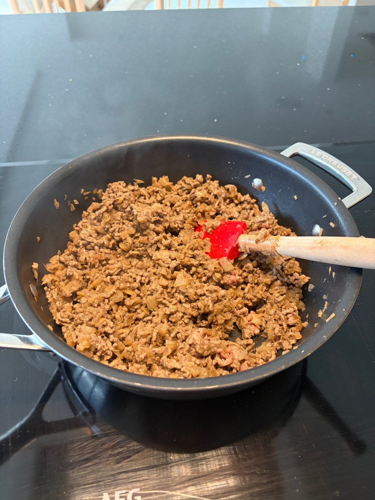 Brown the mince, this is halfway done. You need to brown it enough so that there is no raw meat showing.