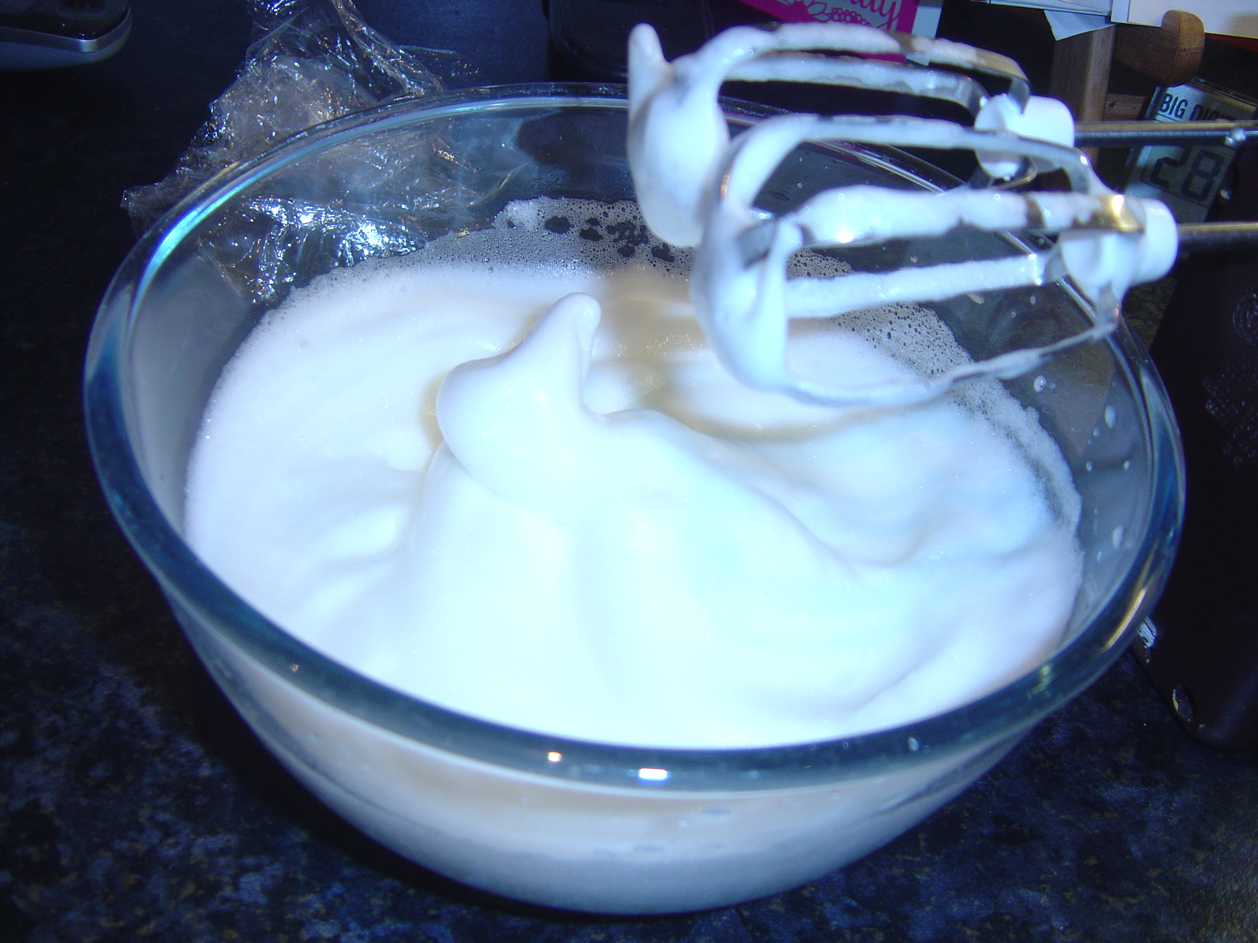 - Slowly add the sugar, bit by bit and whisk until really thick and shiny