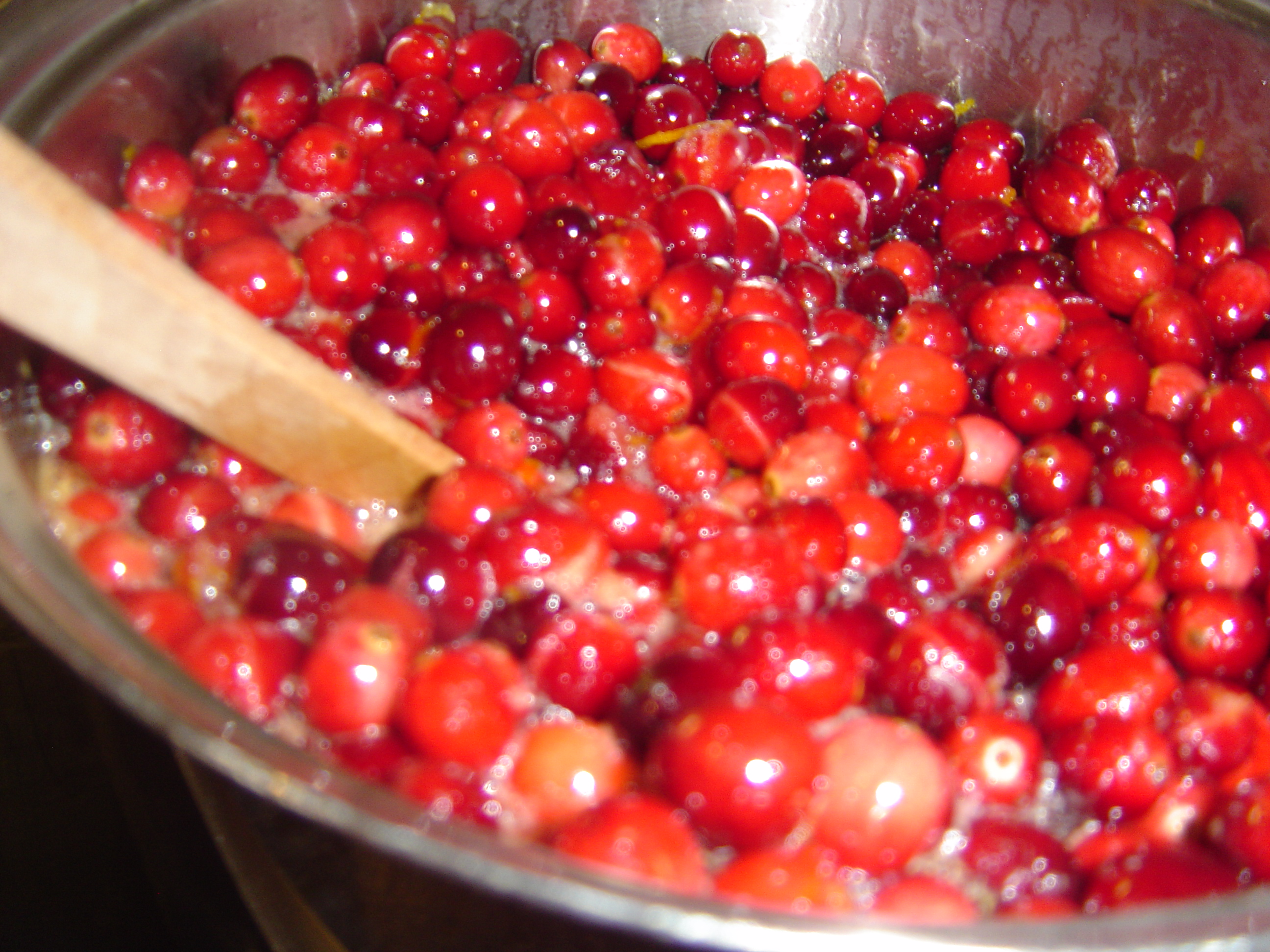 • Add the cranberries and bring to the boil – this is the best bit as you can hear the beautiful little red berries popping.