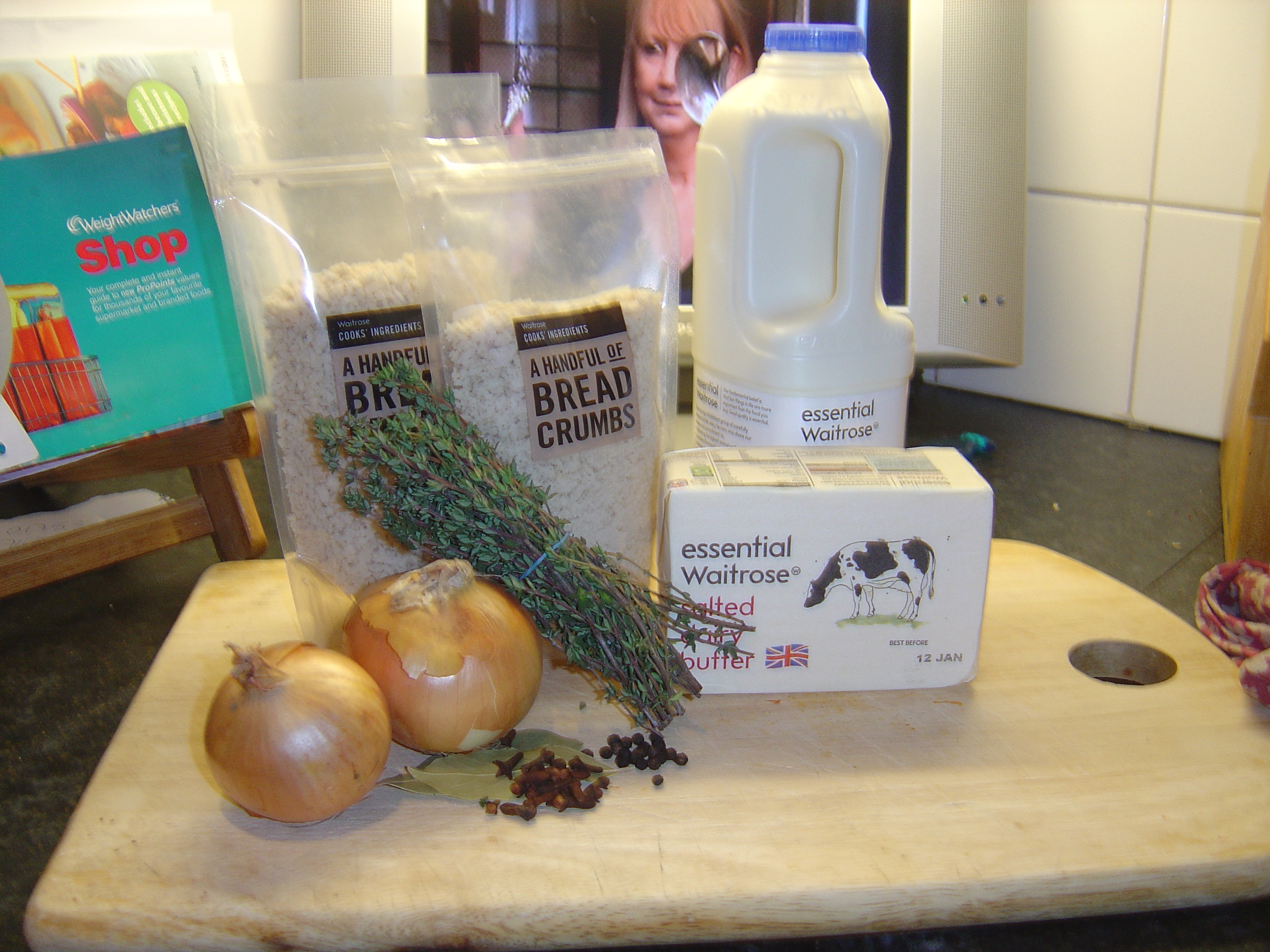 Ingredients: 1 small or half of a large, mild white onion, finely chopped (don’t use a red onion, it won’t work), 10 cloves, 10 peppercorns, 1 bayleaf and 2 sprigs of thyme, 500ml full cream milk, 100g butter, 100g of dried white breadcrumbs or cubed, stale white bread, Salt and pepper to taste