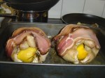 Cook chicken at 220C non fan/200C fan/gas mark 7 for 10 minutes, then turn the oven down to 190C/375F/gas mark 5 and allow 45 minutes per kg, plus 30 minutes. However, the real test of whether your chicken is cooked is if you stick a skewer in to the thigh joint and the juices run clear. 20 minutes before the chicken is ready, place bacon on top if you wish and raise the temperature to Gas Mark 7, 220 degrees non-fan, 200 degrees fan.