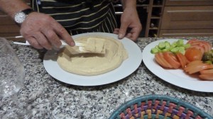 You have to be impressed by any kind of food that has so many spellings and no-one is completely sure what the correct one is! For the moment, I am going to use Houmous (although Joe uses Hummous). Spelling apart, I have always bought my Houmous from the supermarket in convenient little tubs, but that was before I knew how incredibly simple it was to make. I was also impressed that most recipes don’t include any oil other than for garnish, so it was also a lot less fattening than I had thought. So now on to the recipe and who better than our local resident expert on middle eastern cookery to show us? Pictured below with the lovely Helen.