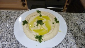 He then drizzles virgin olive oil on it and some finely chopped parsley, he would normally keep a few of the whole chickpeas to decorate with, but we forgot and blitzed them all! It may also be nice to add some finely chopped red peppers or chillis for a real spicy kick.