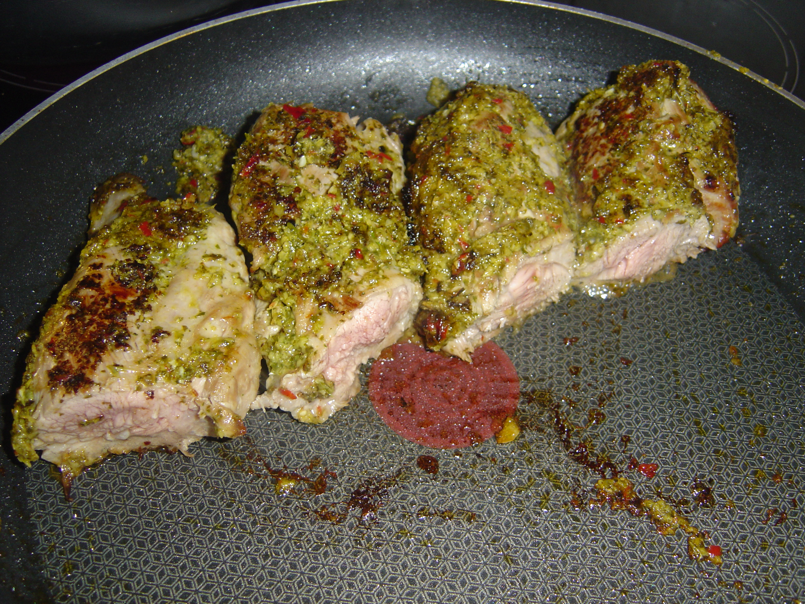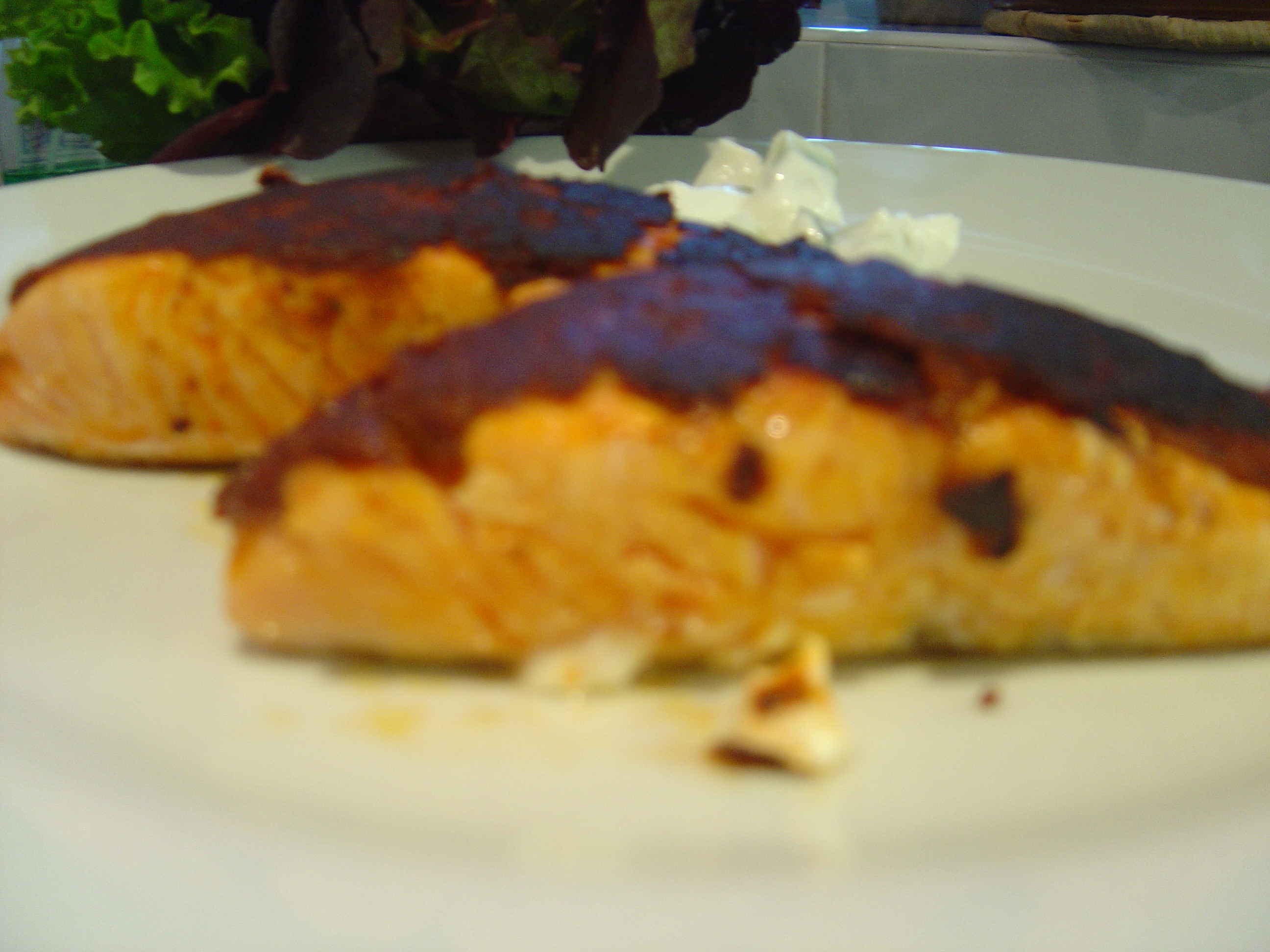 I spread just one side of 6 pieces of skinned salmon fillet with the mixture, then placed a heavy frying pan on the heat until it was very hot. I placed the fish mixture side down for 2-4 minutes or until it was blackened, then flipped it over for a further 2 to 3. Take it off the heat and leave for a few minutes, the fish will continue to cook through.