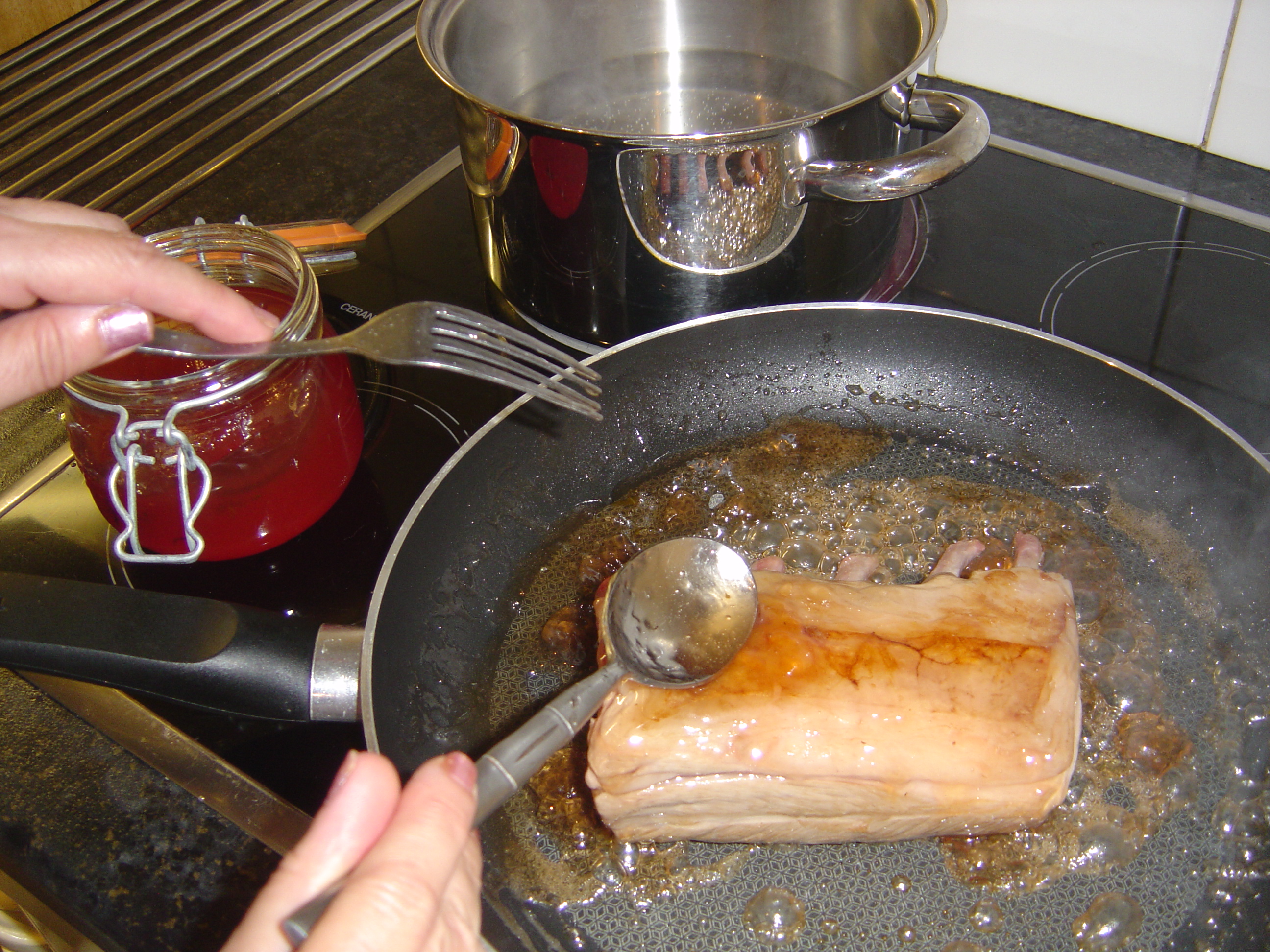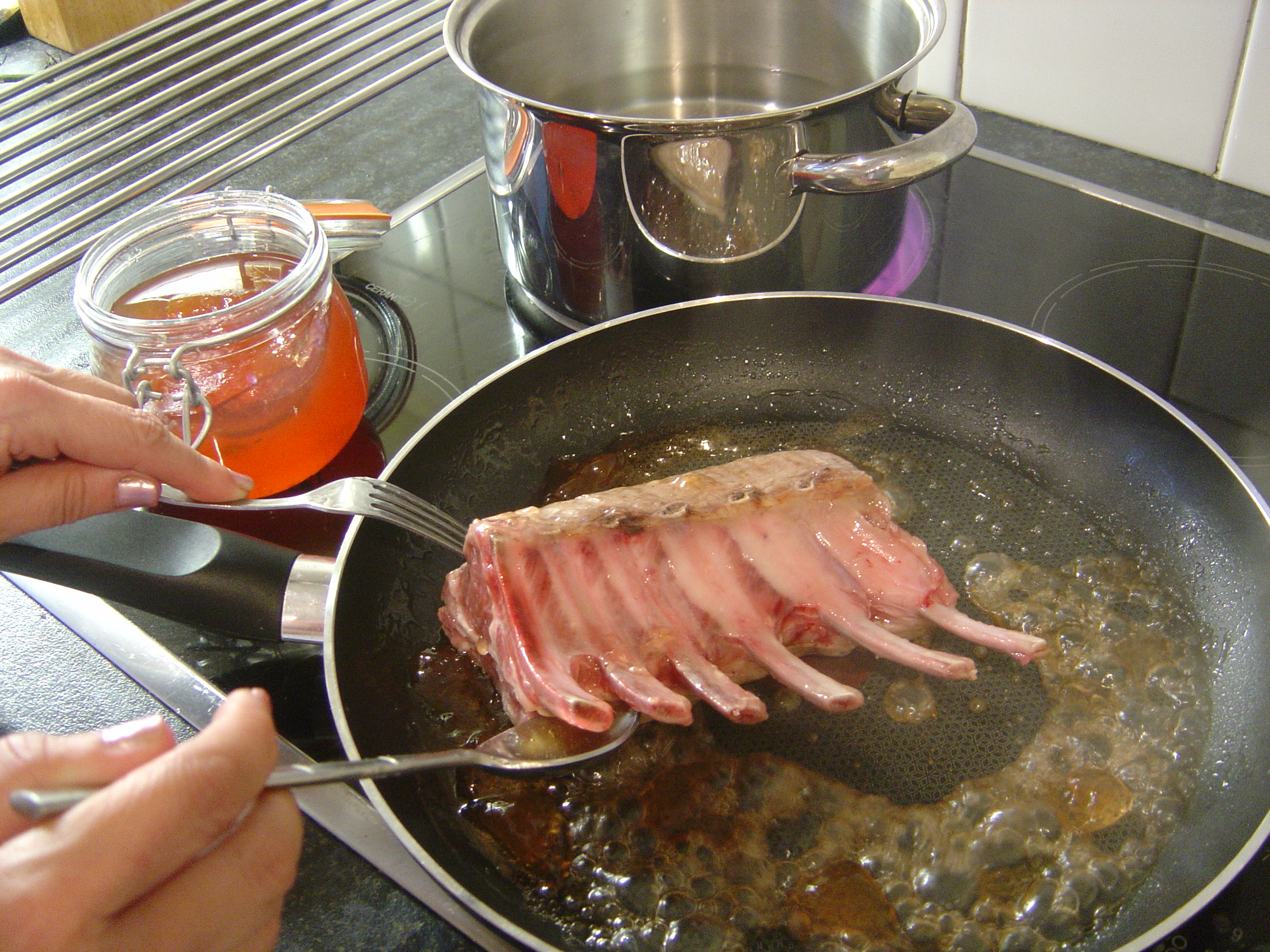 Anyway….all you need for this is…. a rack of lamb, approximately 6 to 8 chops, if much bigger take care to adjust the cooking time, 2 large tablespoons of mint jelly and that’s it! pre-heat the oven to Gas Mark 6, 200C/180 fan. Place the mint jelly in a large frying pan over a medium heat, as the jelly starts to melt, place the rack of lamb in the pan, and baste with the jelly as it starts to caramelise, keep doing this for about 5 minutes until the whole of the rack of lamb is covered in a lovely gooey sauce. Remove the lamb and scrape the rest of the sauce over it and place in an oven proof dish in the pre-heate dovern for 25 to 30 minutes . You will need to check on the weight and size of your joint for exact cooking times, but this should give you nice pink chops with a lovely caramelised, brown outside. Serve with any of your favourite vegetables. How easy was that? This works for lamb fillet but has a much shorter cooking time. You can also vary the jelly, it is wonderful with redcurrant and also with chilli jelly, recipe for home-made jellies coming next week., get your jelly bags ready