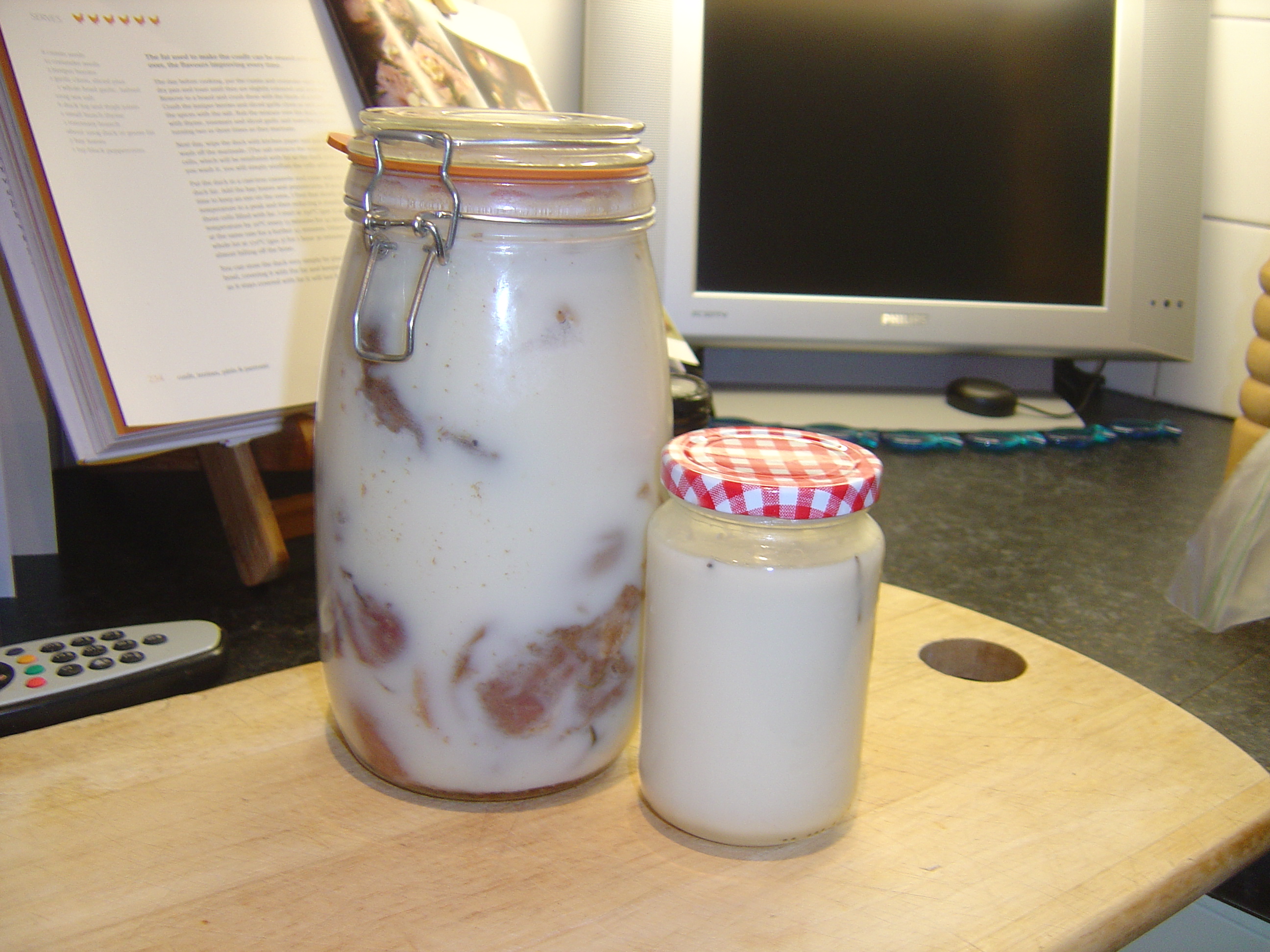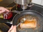 Remove the duck legs and strain the remaining liquid into a bowl through a sieve and retain.