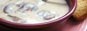 Method: Place 50g of the butter, the chopped onion, bayleaf, thyme and garlic in to a large saucepan and cook on a low heat for 5 to 10 minutes until they are soft and translucent looking but do not let them start to go brown…this is called sweating! Add the chopped mushrooms and cook for a further 5 minutes. Add the stock and bring to the boil, then reduce to a simmer for a further 20 minutes. Take out a few of the chopped mushrooms and place on one side to use as a garnish. Then either place the mixture in to a food processor and blend or use one of those lovely hand held blenders straight in to the saucepan to liquidise your soup. Taste and season according to your preferences. At this point, you can place it in the fridge and heat it up later if you want to, or freeze it. When you’re ready to serve, heat it until boiling, then whisk the remaining 50g of butter in to the soup, remove from the heat and place in to bowls, add a small amount of cream on top of each bowl and some of the reserved mushrooms.