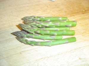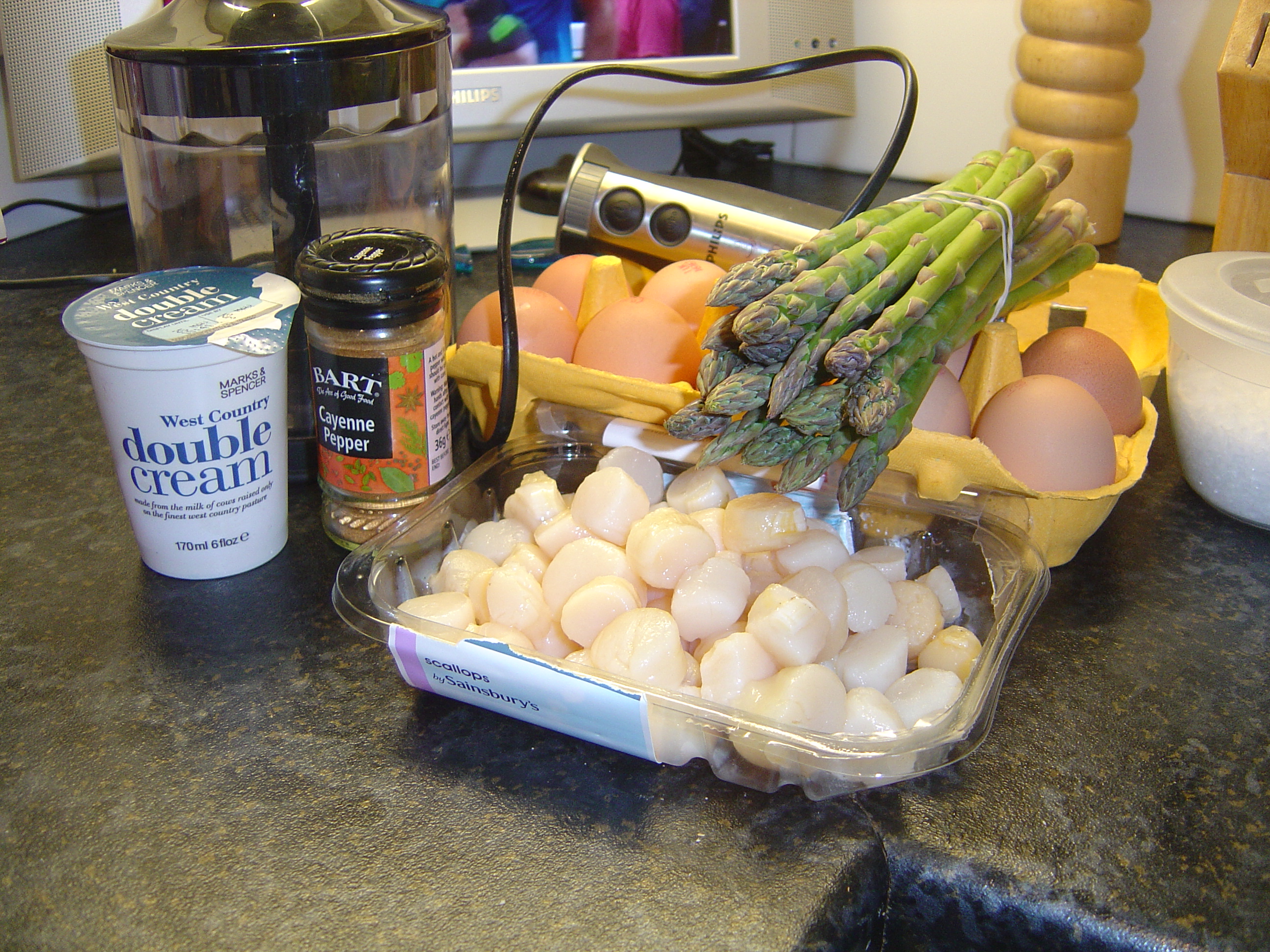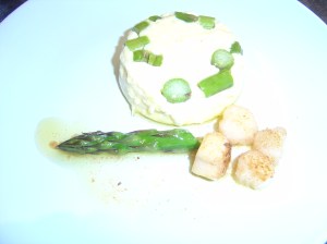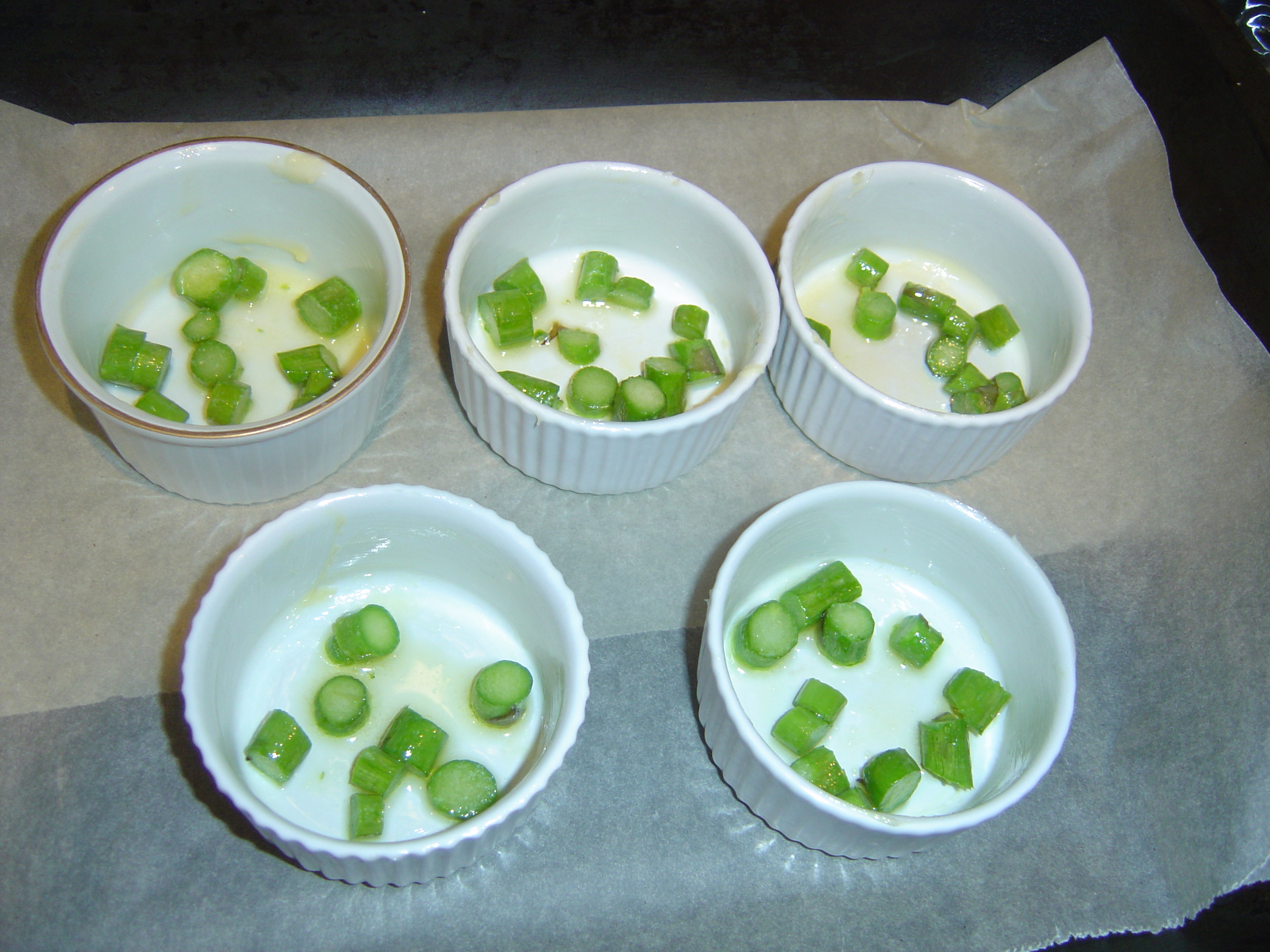 You will need 4 -6 small ramekins (those funny little ovenproof dishes) Ingredients: Enough butter to generously grease the dishes, 150g/5ozs scallops (white only no corals), 2 large eggs, 200m/7fl ozs double cream, pinch salt and some cayenne pepper. Alain used fresh herbs but I missed these out and used some of the asparagus ends lightly sauteed instead:To garnish: 25g/1oz butter, 150g fine asparagus, lemon juice and 4 large scallops (white only) (Alain made more of a sauce, I kept mine a little simpler)