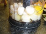 Firstly, to ready yourself for your ordeal, construct your French Sherbert. Take equal quantities of gin, cointreau, freshly squeezed orange and freshly squeezed lime juices, pour into a cocktail shaker with about 6 larges cubes of ice and shake aggressively for about 15 to 20 secs or until your arm falls off. Strain into a 5oz cocktail glass and garnish with segment of lime. I use a 1oz (30ml) pour, so that makes 4oz of cocktail which fits nicely in the 5oz glass. This cocktail produces a fresh tingle on the tongue reminiscent of lemon sherbert, and according to an acquaintance, is ‘fabulous, I could drink buckets of it’. Freshened by the Sherbert, the prep can now begin. For the roasted garlic paste, about 120ml, you’ll need: 2 heads of garlic, 2 tablespoons of olive oil, 1 tablespoon sugar, 1 teaspoon of kosher salt (oi-vey) (Not sure we can get this, Pete, is ordinary salt ok?), a child’s handful of chopped fresh flat-leaf parsley, ground black pepper, pinch of cayenne pepper, 3 tablespoons water.