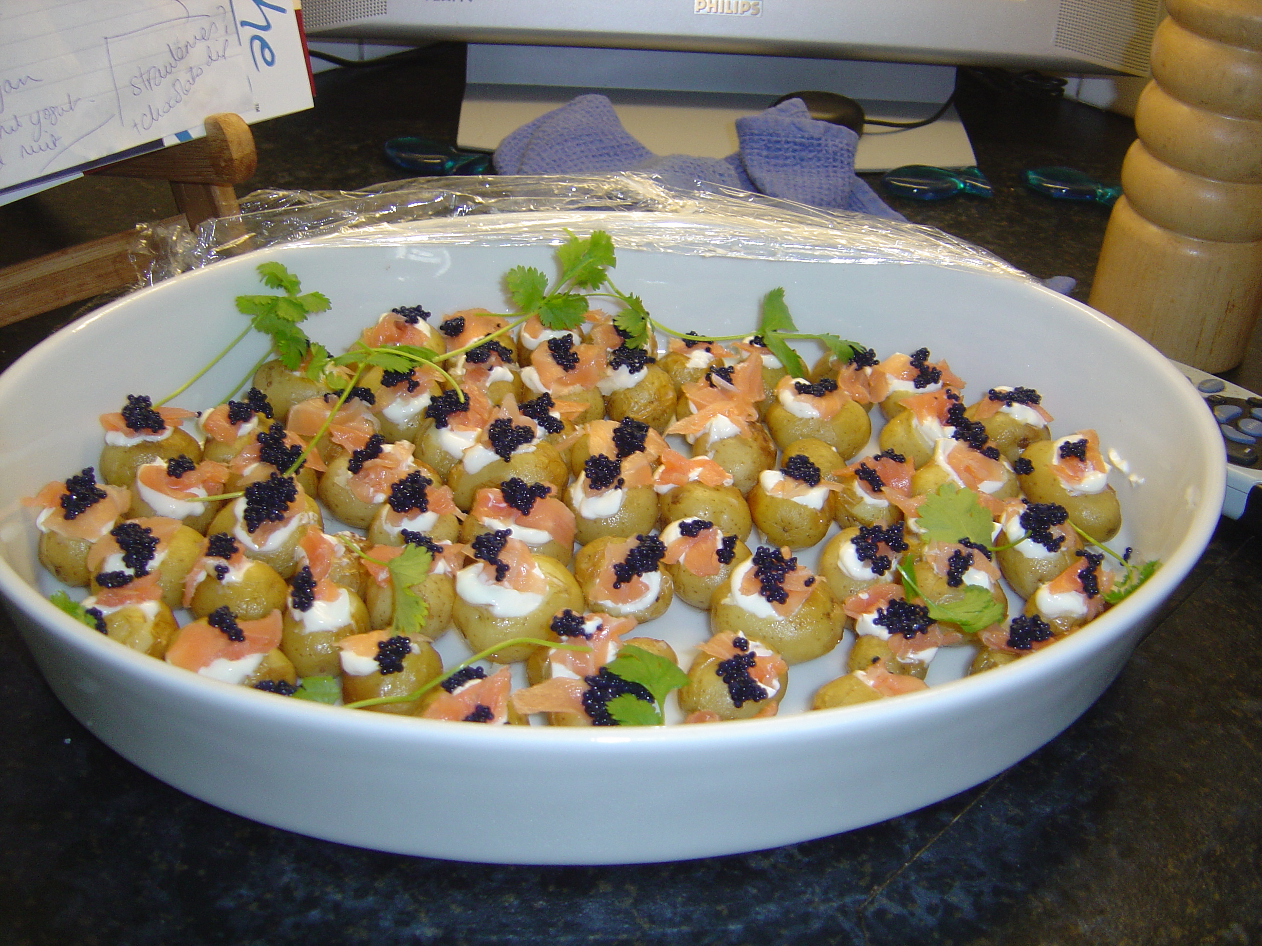 New potatoes stuffed with smoked salmon: You will need the smallest new potatoes you can find, just roast them with groundnut oil and sea salt for about 20 minutes, Gas Mark 6/200C or 180 Fan. Allow them to cool and then using the end of a vegetable peeler, scoop out a little hollow in each one. Just before serving fill them with sour cream, a little smoked salmon and a tiny bit of caviar (real or faux depending on your budget!). These are also really good with crumbled crispy bacon instead of smoked salmon.
